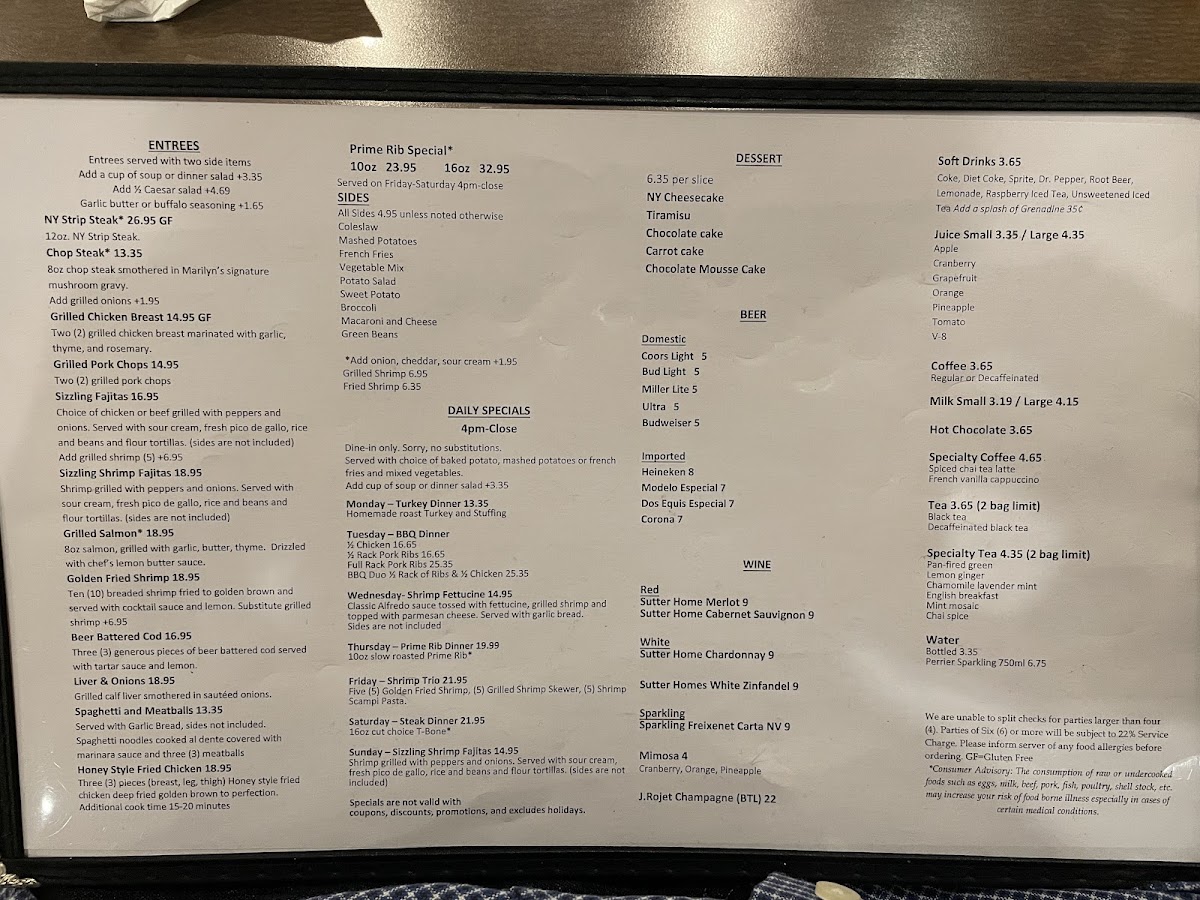 What stands out is the attention to detail—whether it’s the perfectly timed service asking for crispy or regular bacon or signature specials like the Prime Rib Scramble accompanied by toast and hash browns. The salmon entrée with mashed potatoes and mac & cheese has delighted many repeat guests, complemented by irresistible desserts like rich chocolate cake. Paired with popular domestic beers or Perrier sparkling water, Marilyn’s Cafe creates an inviting atmosphere where great food, value, and genuine service come together seamlessly.